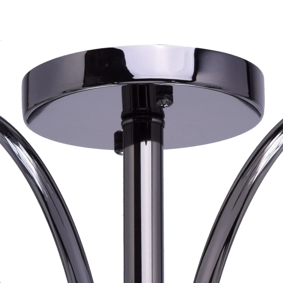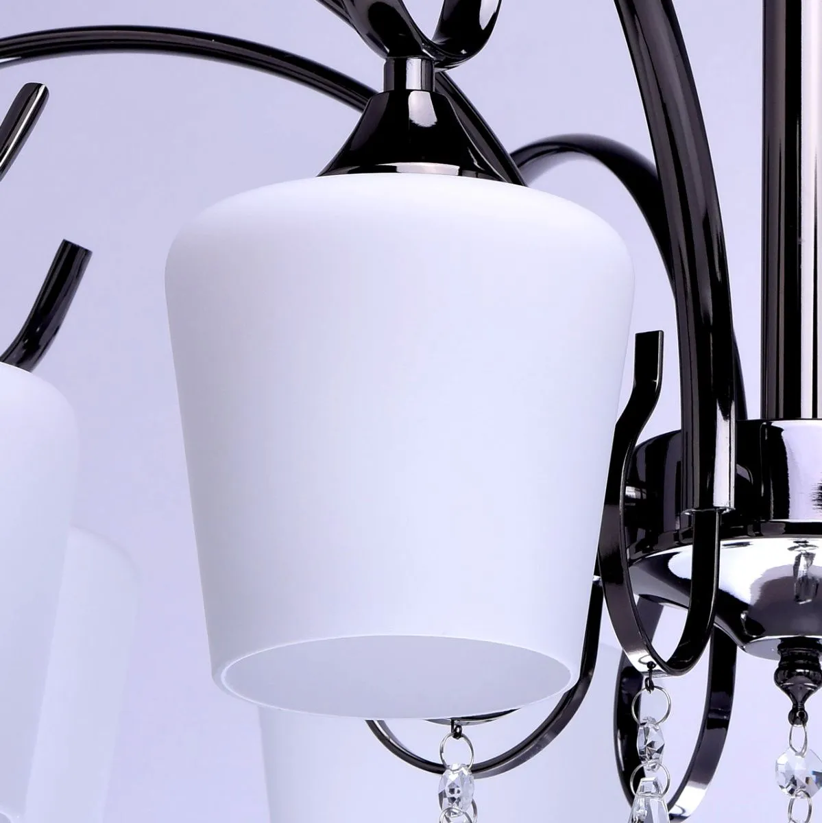 Металлическое основание цвета никеля. Плафоны: стеклянные матированные плафоны. Декор: хрустальные